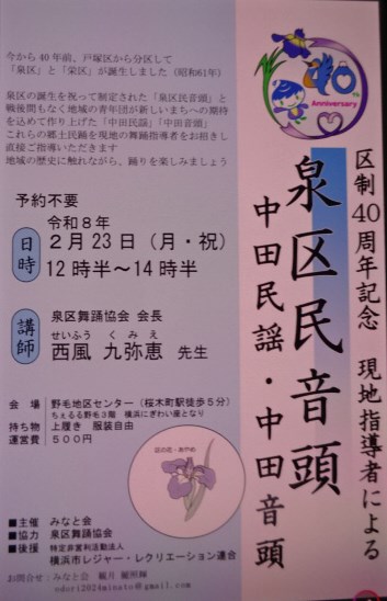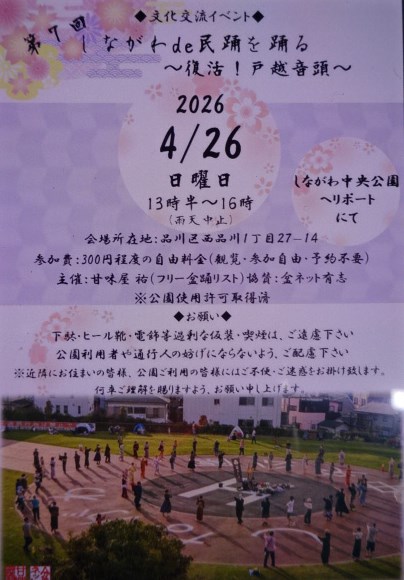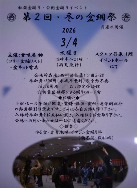 いつも東京盆踊り情報を御愛読頂きまして誠にありがとうございます。実は1月18日に使っているパソコン(PC)が私の意に反して暴走しこの東京盆踊り情報が総て消えてしまいました。PCの知識が無い私は途方に暮れてしまいましたが、ありったけの知識を総動員してどうにか昨年令和7年9月7日以前分が復活してくれましたが、逆に9月7日以降、本年1月17日までの分が復活出来ていません。この間の主な盆踊り関係記事は、1/4のすみだ輪おどり、令和7年11/23の戸越八幡神社、11/22の一橋大学、11/16の江戸川区鹿本小学校、11/3の国立市民まつり、10/20のべったら市、10/12の練馬高野台氷川神社、10/10の新宿区荒木町公園、10/5の新秋津氷川神社、10/4の六本木龍土町天祖神社、9/28の世田谷区羽根木神社、9/27の江戸川区椿天祖神社、9/26の港区青葉公園、9/21の新宿区杉大門、9/20の港区泉岳寺前児童公園、9/19の港区赤坂氷川神社、9/15の新宿区原町天祖神社、9/14の板橋区緑ヶ丘第二公園、9/13の墨田区牛嶋神社氏子町会一帯、9/12の港区芝新堀公園で、